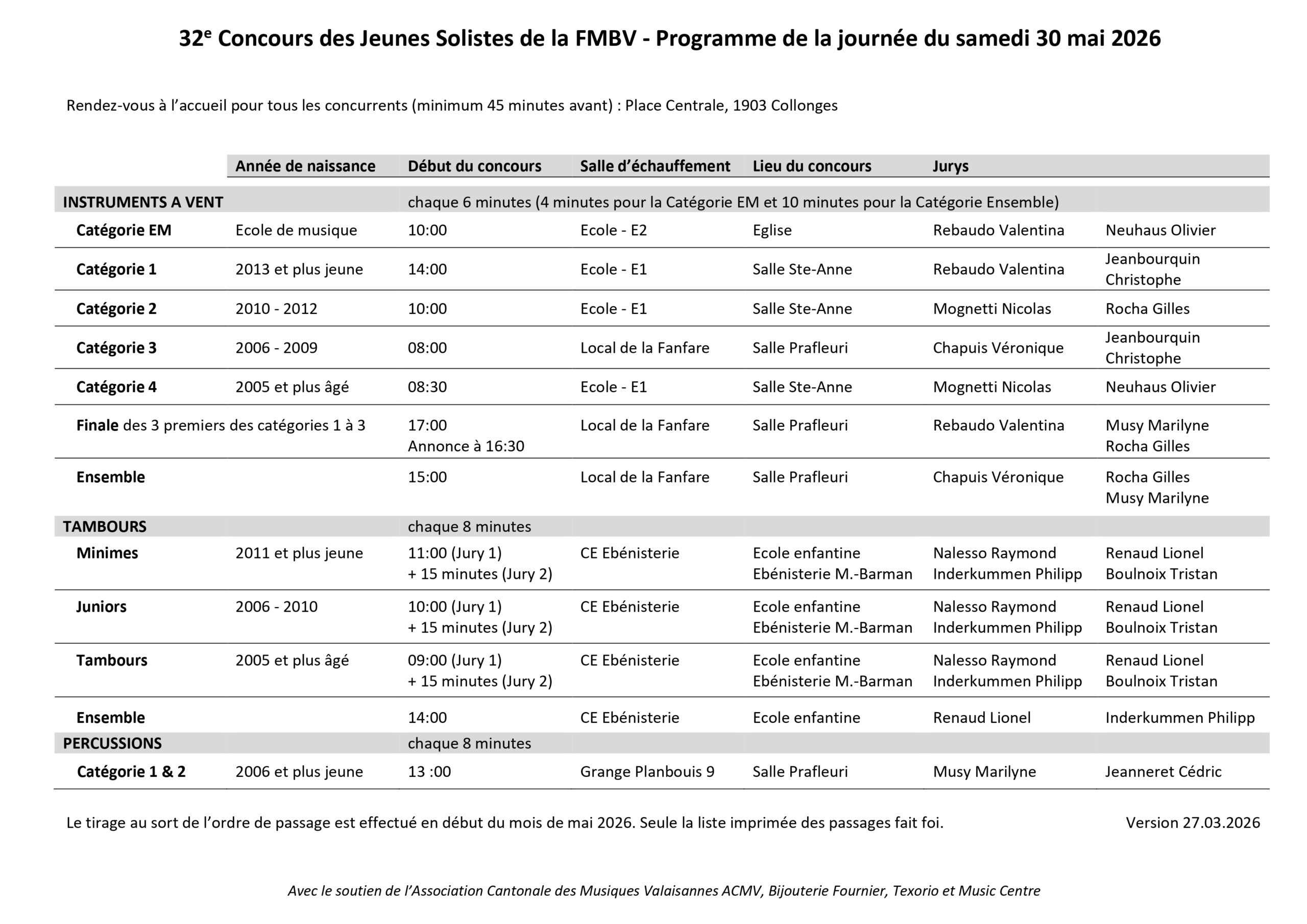 Une fois de plus, les jeunes musiciens issus des fanfares de la FMBV ont brillé à l’occasion d’un concours de soliste, en l’occurrence lors du Concours national de solistes et quatuors d’instruments de cuivre (www.cnsq.ch) qui a eu lieu les 28 et 29 mars 2026.
