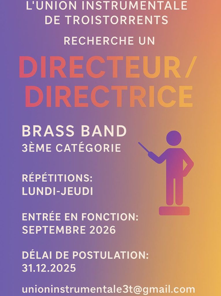 28 Oct L’Union instrumentale de Troistorrents cherche un directeur! L’Union instrumentale de Troistorrents recherche un directeur pour la saison 2026-2027…Contactez-les si diriger une fanfare dynamique et motivée vous intéresse !